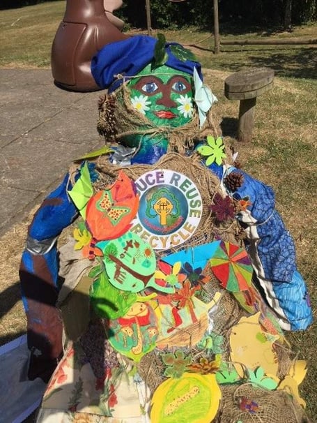 ‘Mother Earth’ has a ‘Reduce, Reuse and Recycle’ theme. She was made by the Art Clubbers from recycled newspapers and plastic bags. Year 6 painted her to represent the land and seas and her outfit was made from donated fabric samples, on which the children created nature inspired silhouettes. The patterned leaves on her top were inspired by their class names – Acorn, Beech and Oak and were decorated by Beech Class.