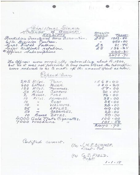 Henry Bray was from Ross-on-Wye, and he lived at 133 King Street. On Christmas Day, 1917, the Officers arranged for a festive dinner. The items they had brought in as a special treat for the men are shown in the pictured receipt.