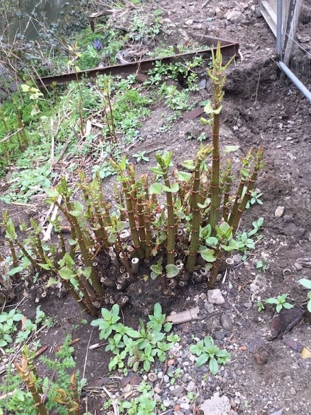 Japanese knotweed first arrived in UK in 1850 in a box of plant specimens delivered to Kew Gardens. Favoured for its rapid growth and heart-shaped leaves, it was quickly adopted by gardeners and horticulturists who were oblivious to its invasive nature. Knotweed hibernates over winter but in spring it begins to grow, with red or purple spear-like shoots emerging from the ground which quickly grow into lush green shrubs with pink-flecked stems and bamboo-like canes.