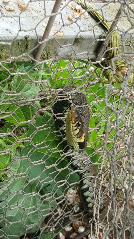 At this time of year when the weather gets warmer, grass snakes will head to damp, cool places like ponds to manage their internal temperature but can sadly become ensnared in fencing or netting.